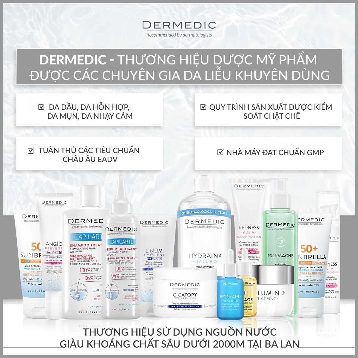 Thermal water: Cung cấp khoáng chất tự nhiên, giúp làm dịu và cân bằng độ ẩm cho da, giảm viêm và sưng đỏ.