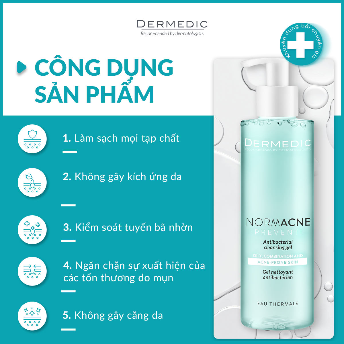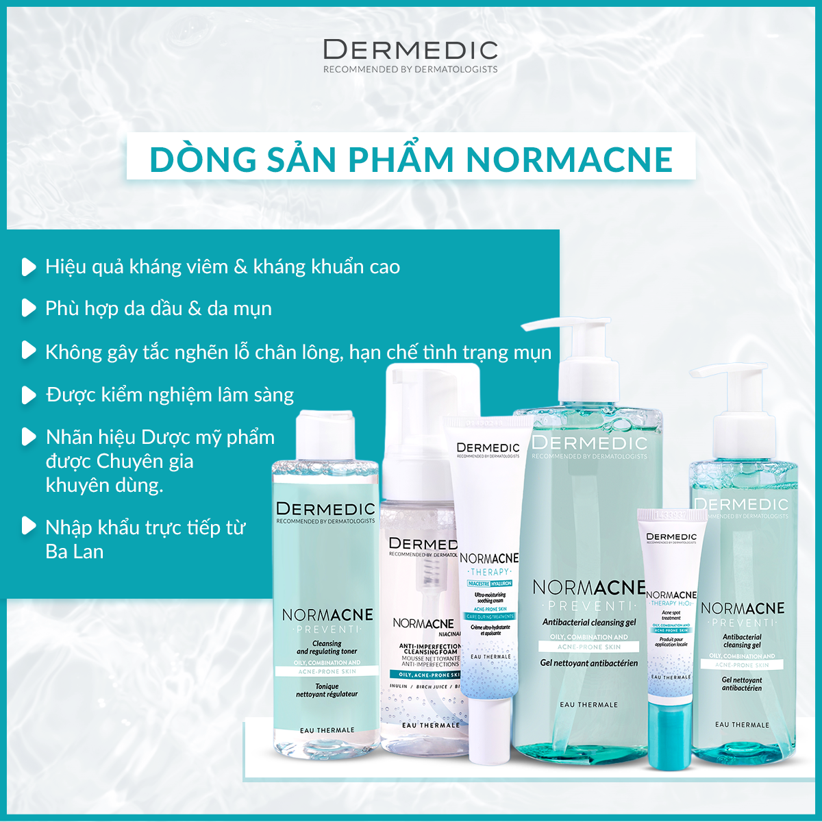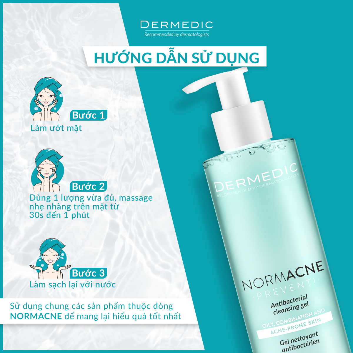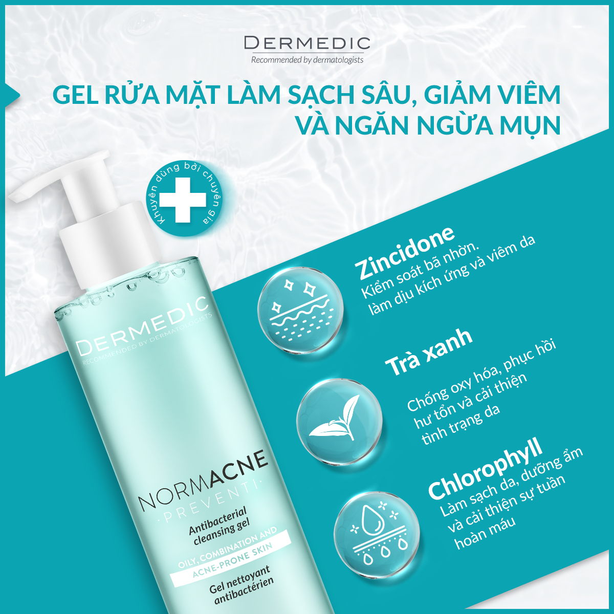 Dermedic là thương hiệu dược mỹ phẩm đến từ Ba Lan, được hơn 30.000 Chuyên Gia Da Liễu khuyên dùng. Sản phẩm Normacne Antibacterial Cleansing Gel là sản phẩm lý tưởng cho những ai đang tìm kiếm giải pháp làm sạch da hiệu quả, an toàn và lành tính cho da dầu mụn. Với công thức dịu nhẹ, kết hợp các thành phần kháng khuẩn, chống viêm và điều tiết bã nhờn hiệu quả, sản phẩm giúp làm sạch sâu da, loại bỏ bụi bẩn, bã nhờn và vi khuẩn gây mụn, đồng thời kiểm soát lượng dầu thừa trên da, giúp da luôn khô thoáng và mịn màng.