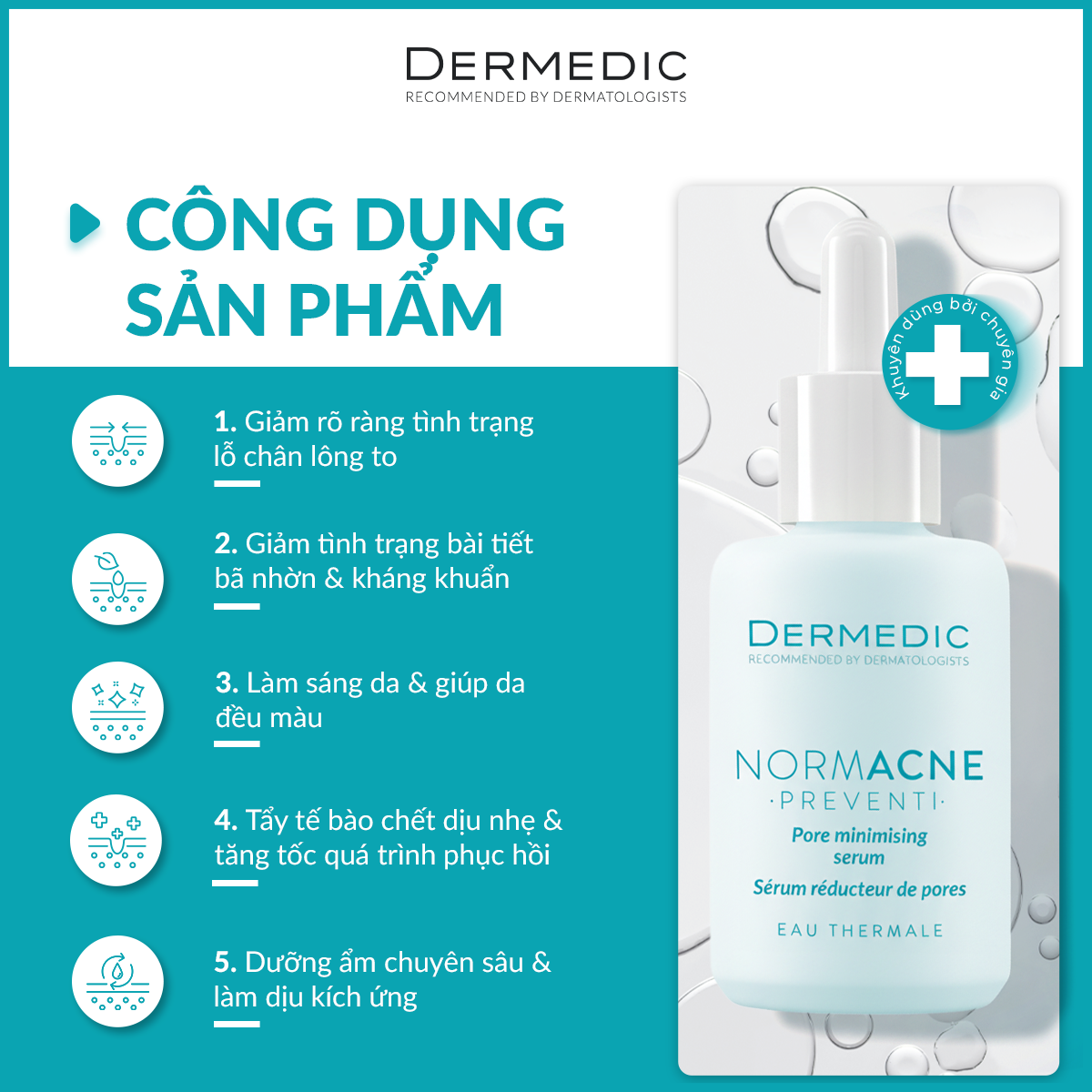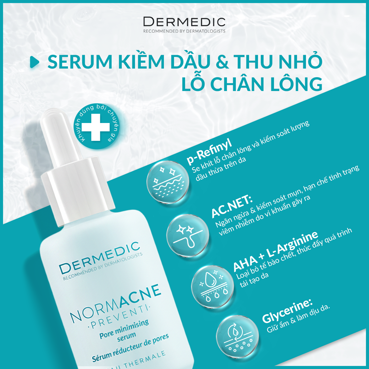 Se khít lỗ chân lông đến 62%: Lỗ chân lông to thường là vấn đề đi kèm với da dầu mụn, tạo cảm giác da không đều màu và dễ xuất hiện mụn. NORMACNE Pore Minimizing Serum tác động trực tiếp lên bề mặt da, làm se khít lỗ chân lông đáng kể, mang lại làn da mịn màng hơn sau khi sử dụng đều đặn.