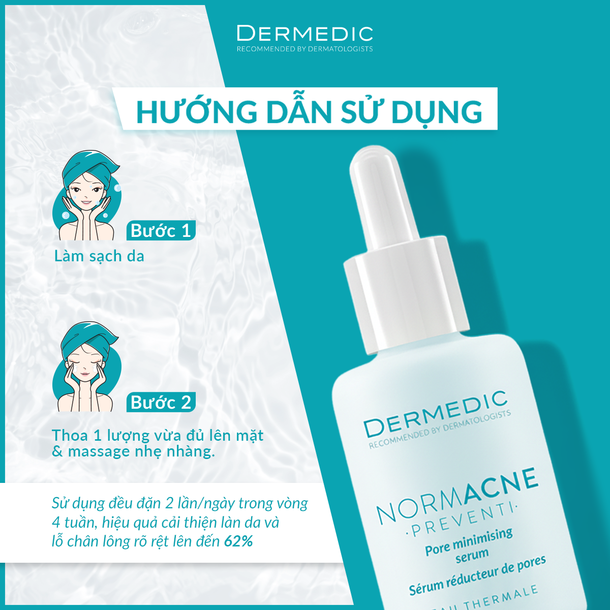 Sau khi làm sạch da, lấy một lượng serum vừa đủ thoa lên những vùng da có lỗ chân lông to như vùng mũi, trán và cằm.