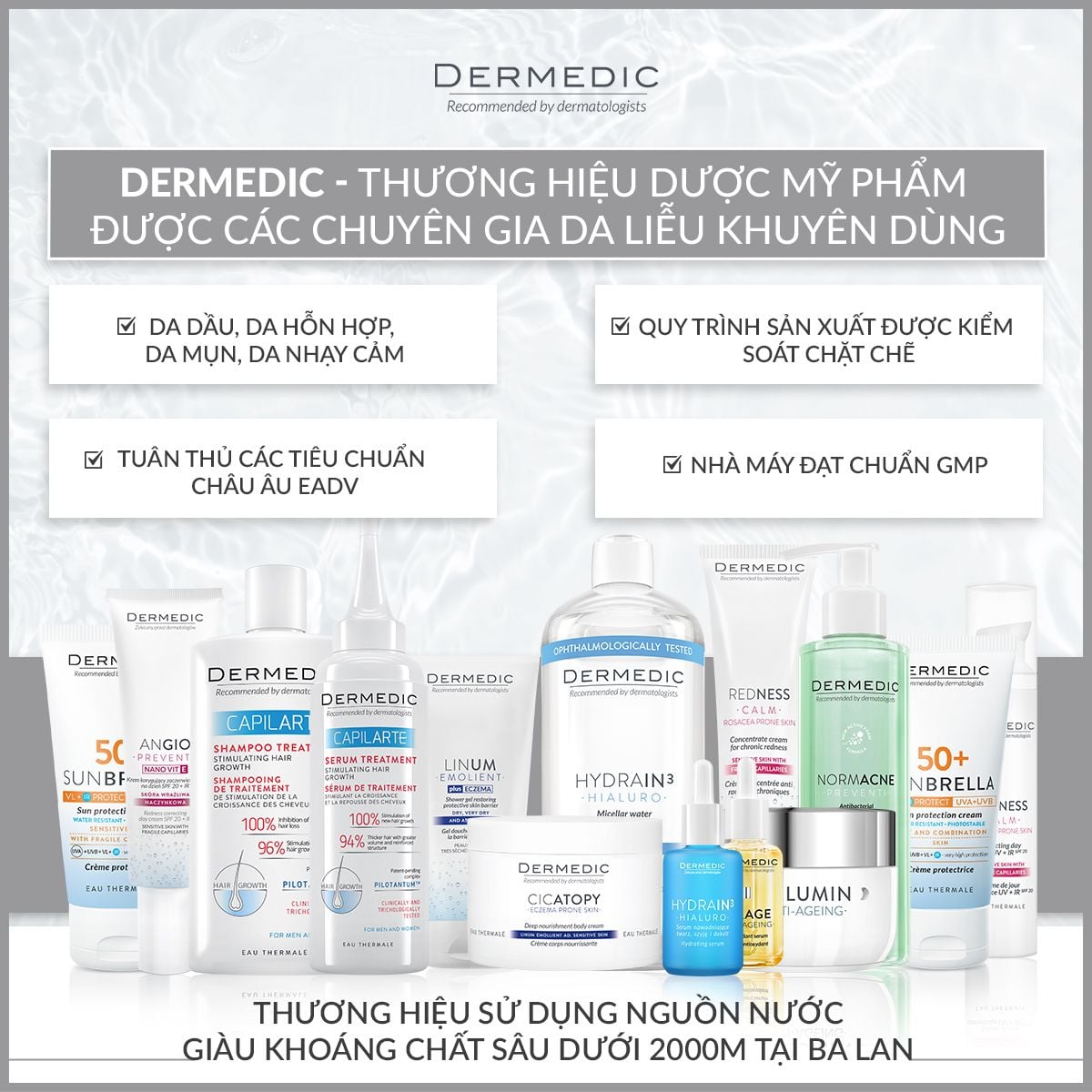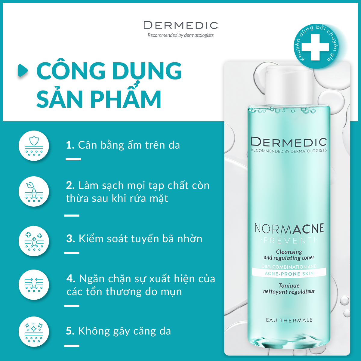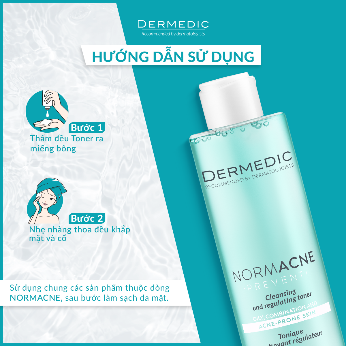 Dermedic là thương hiệu dược mỹ phẩm đến từ Ba Lan. Sản phẩm Normacne Cleansing And Regulating Skin Toner là sản phẩm lý tưởng cho những ai đang tìm kiếm giải pháp an toàn và lành tính cho da dầu mụn. Với công thức dịu nhẹ, kết hợp các thành phần kháng khuẩn, chống viêm và điều tiết bã nhờn, sản phẩm giúp làm sạch sâu da, loại bỏ bụi bẩn, bã nhờn và vi khuẩn gây mụn, đồng thời kiểm soát lượng dầu thừa trên da, giúp da luôn khô thoáng và mịn màng.